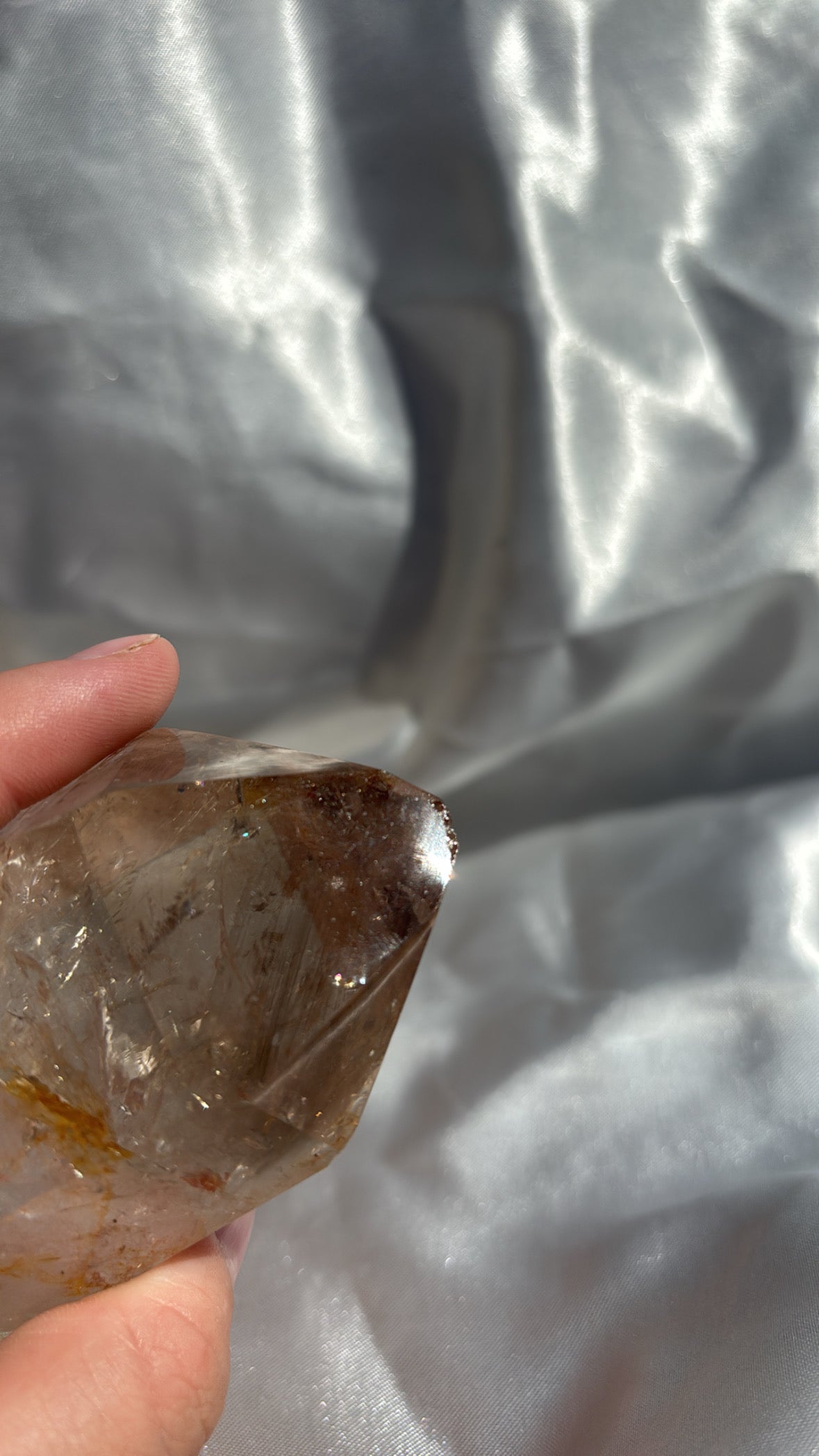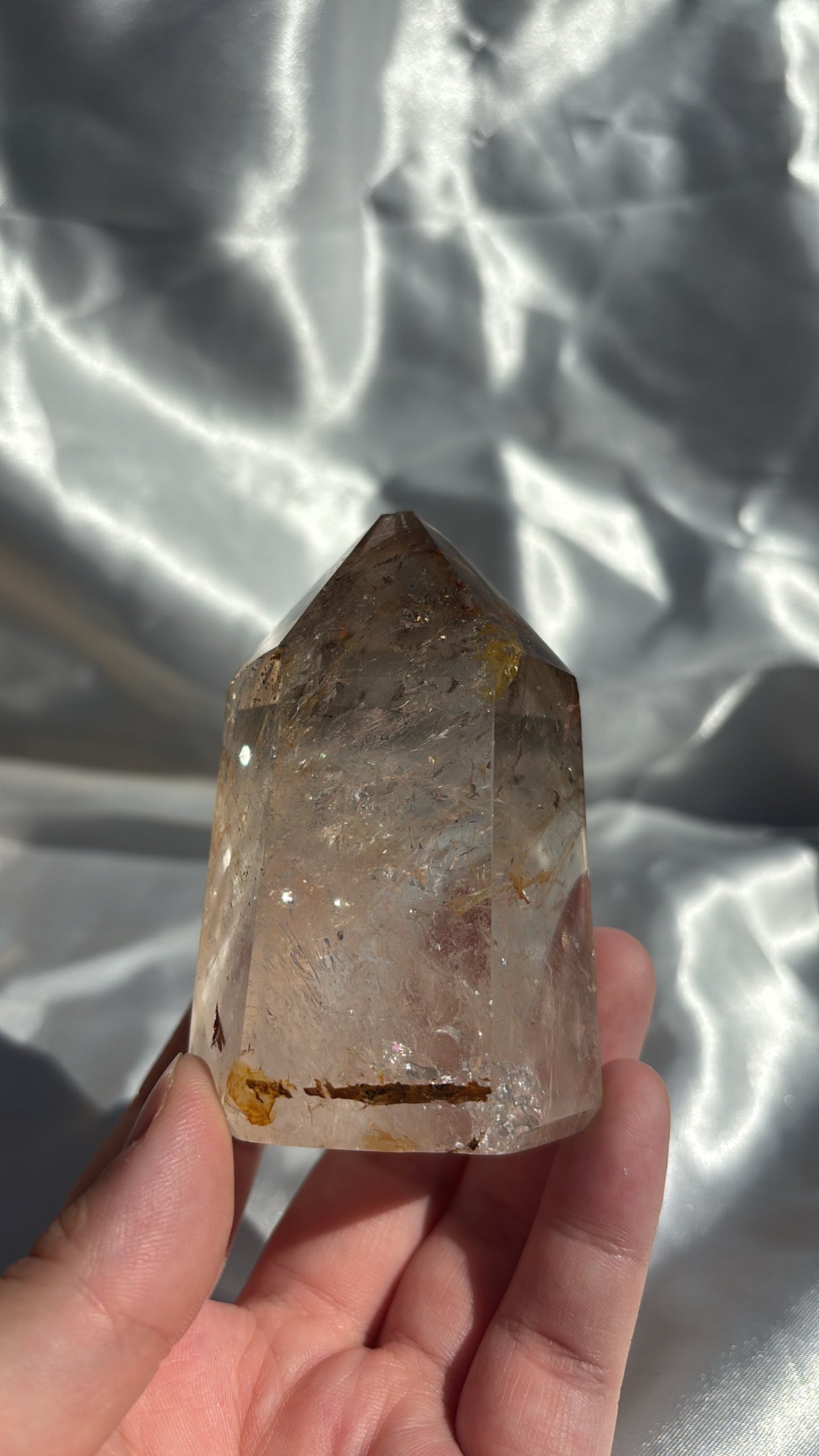 Clear Quartz Tower With Golden Healer And Smokey Quartz Inclusions (Discounted Due to Chipped Tip)