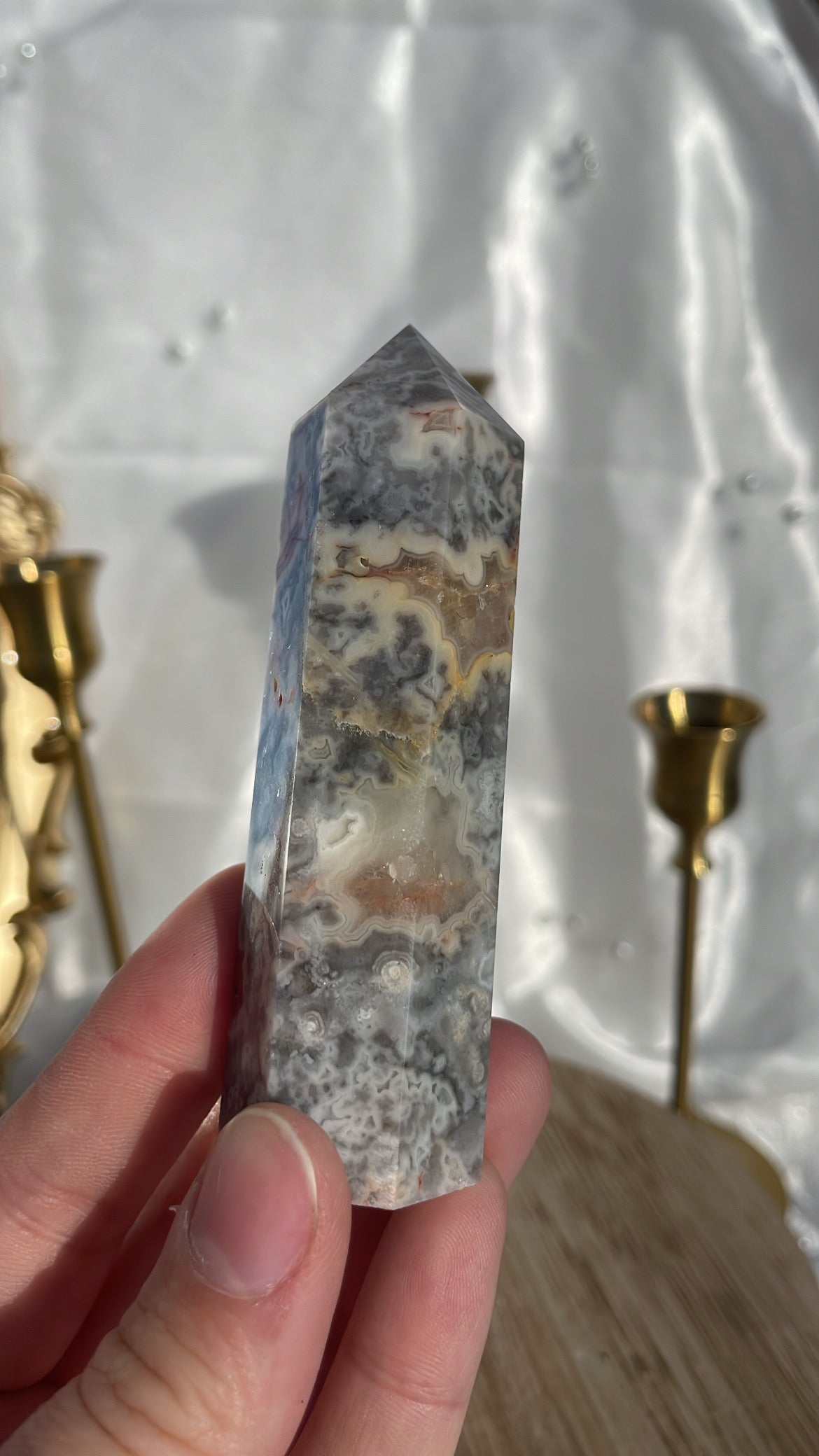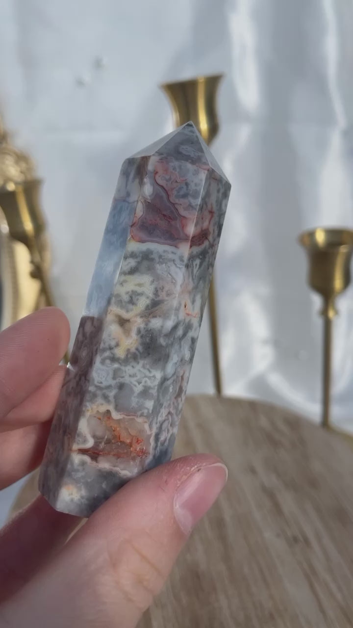 Crazy Lace Agate: known as "laughter stone." Balances, protects, wards off "evil eye," brings joy, absorbs emotional pain.