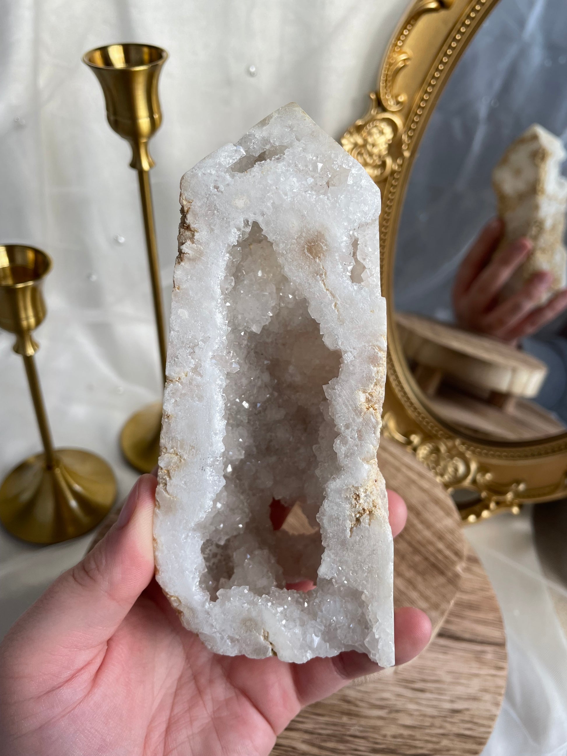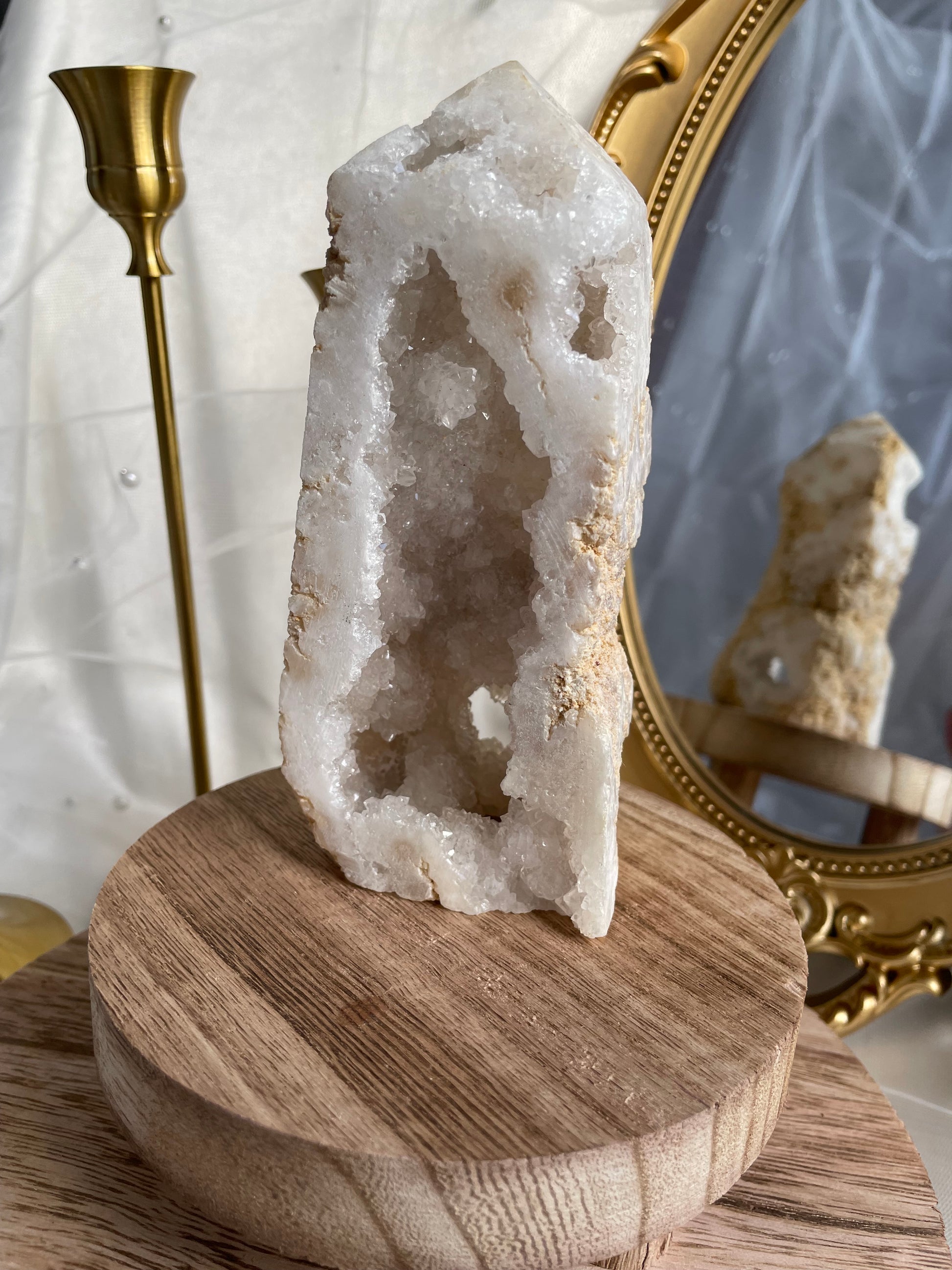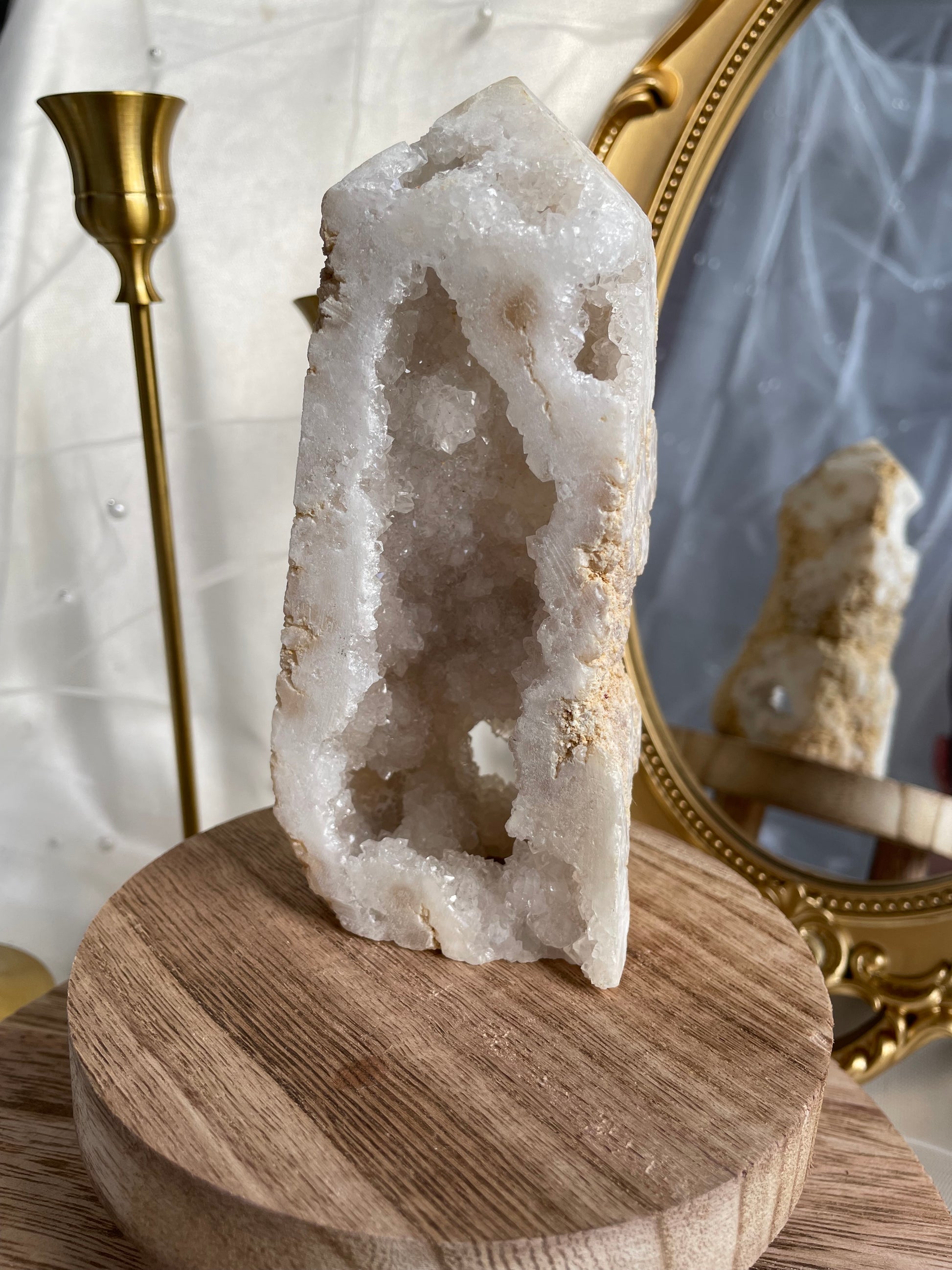 Experience relaxation and tranquility with Druzy Quartz, a natural marvel that enhances peace and harmony. Its captivating crystal formation sparks the mind and inspires creativity.